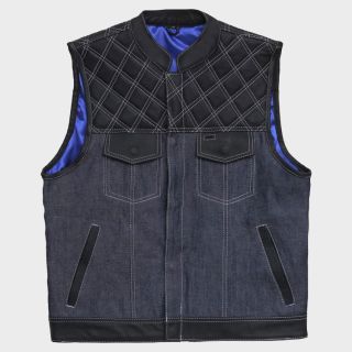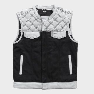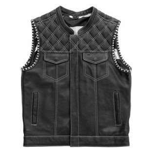 - Club style vest with one inch collar, covered snaps and hidden cropped zipper
